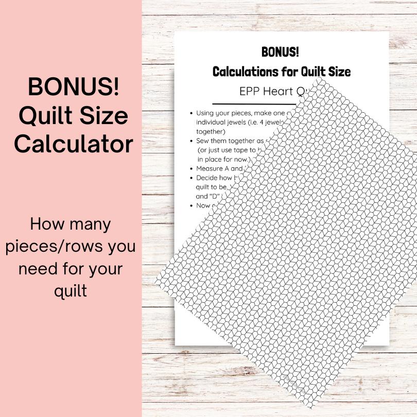 - BONUS - heart quilt size calculator telling you how many pieces you need for your own unique quilt
